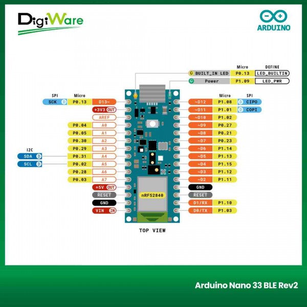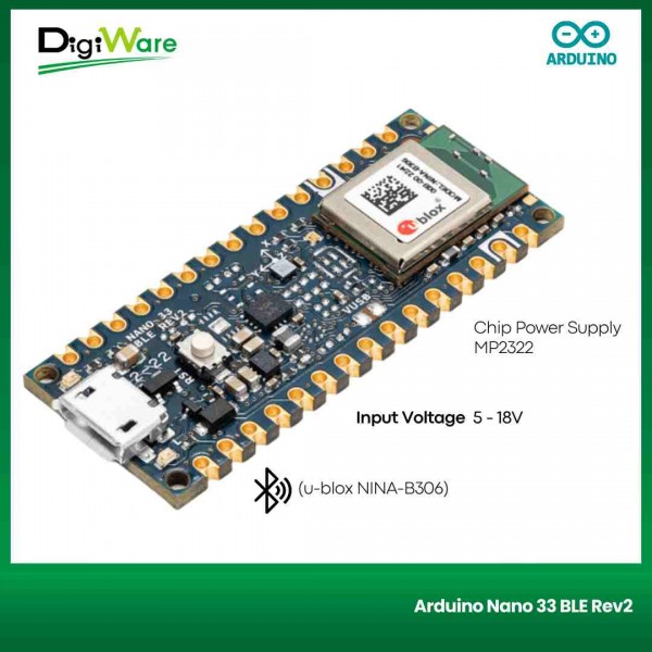 Arduino Nano 33 BLE Rev2 merupakan board Arduino berbasis mikrokontroler nRF52840. Board ini juga sudah built-in u-blox NINA-B306 untuk konektivitas bluetooth dan juga sensor BMI270 dan BMM150.