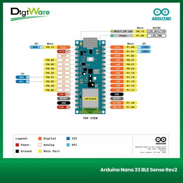 Arduino Nano 33 BLE Sense Rev2 adalah papan AI berukuran sangat kecil yang dilengkapi dengan modul NINA B306 berbasis Nordic nRF52480