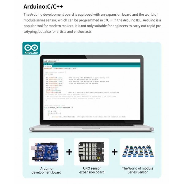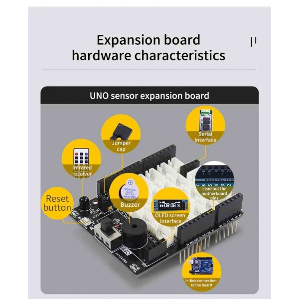 Papan ekspansi yang dirancang untuk memperluas konektivitas pin pada Arduino UNO. Papan ekspansi ini kompatibel dengan modul-modul seri World of Module, sehingga cocok untuk eksperimen edukasi, proyek robotik dan pembelajaran sensor.