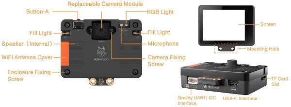 Perangkat ini mendukung port Gravity 4-pin (I2C dan UART) sehingga mudah terbuhung ke mikrokontroller populer seperti Arduino, Raspberry Pi, ESP32, Microbit, dll. Port USB-C menyediakan jalur daya dan data sekaligus. Selain itu terdapat slot TF Card untuk microSD yang memungkinkan ekspansi penyimpanan log, model AI atau data lainnya.