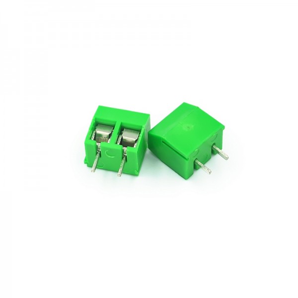 Screw terminal block PCB 2 Pin warna hijau yang memiliki jarak antar pin 5.08mm.