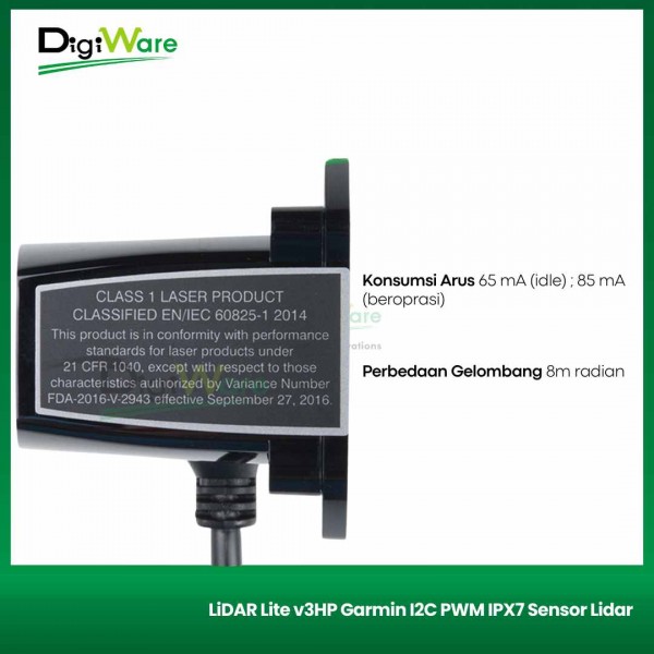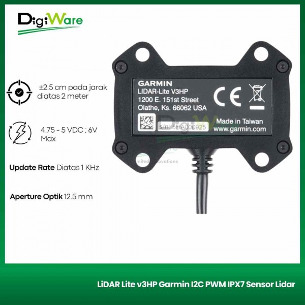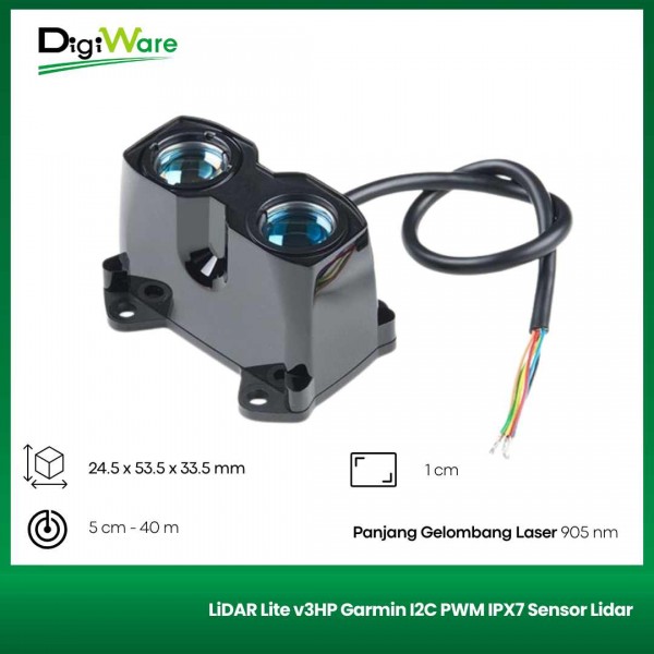 LIDAR-Lite v3HP merupakan sensor LIDAR high-performance yang menggunakan sensor optik dari Garmin™ untuk mendeteksi jarak objek. LIDAR-Lite v3HP sangat ideal digunakan sebagai "mata" pada perangkat-perangkat seperti drone, autonomous vehicle, robot, sistem otomasi, dan sebagainya. LIDAR-Lite v3HP menggunakan case kokoh yang sudah berstandar IPX-7 untuk melindungi sensornya. LIDAR-Lite v3HP memiliki update rate sebesar 1 KHz, konsumsi daya rendah yaitu hanya 85 mA, mampu mendeteksi jarak pada rentang 5 cm - 40 meter, serta menyediakan antarmuka I2C dan PWM untuk output datanya, sehingga bisa diakses melalui mikrokontroler atau mini PC.
