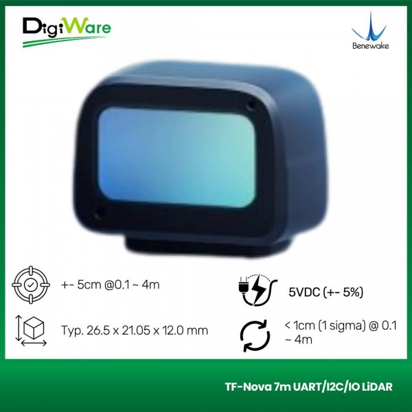 TF-Nova LiDAR merupakan sensor lidar dengan sinar laser berpola garis (line pattern laser beam) yang dibuat oleh Benewake. Sensor ini dapat melakukan pengukuran hingga jarak 14m dengan antarmuka data UART maupun I2C yang dapat dihubungkan langsung dengan kontroler untuk banyak skenario aplikasi seperti deteksi rintangan, trigger untuk aktivasi, dan lain sebagainya.