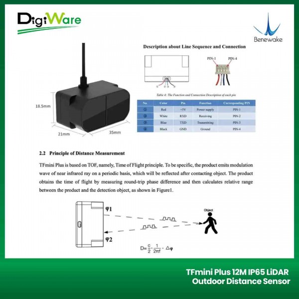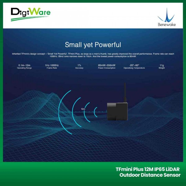 TFmini Plus merupakan sensor LiDAR single-point jarak pendek yang merupakan pengembangan dari versi pendahulunya yaitu TFmini. Pada versi ini terdapat peningkatan yang cukup signifikan dari segi performa, frekuensi pengukuran, akurasi, stabilitas, dan pengurangan jarak blind zone. TFmini Plus juga telah dilengkapi case berstandar IP65 untuk melindungi sensor dari air dan debu pada pengaplikasian indoor maupun outdoor.