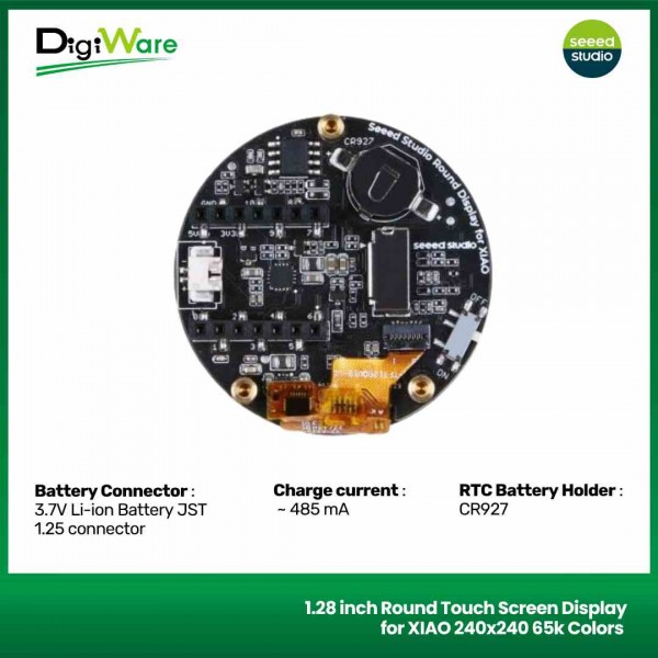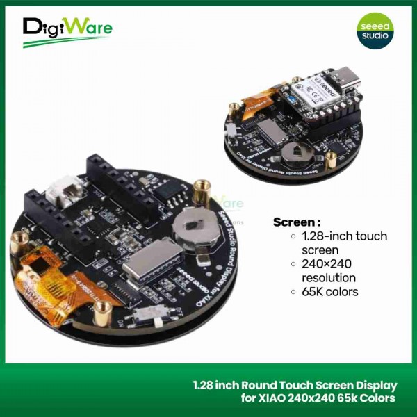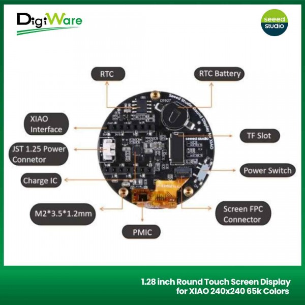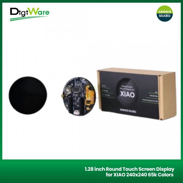 Round Display for XIAO is an extension board with capacitive touch screen and is compatible with all XIAO development boards. It features a fully covered touch screen on one side, designed as a radiant disc with a radius of 39 mm.
