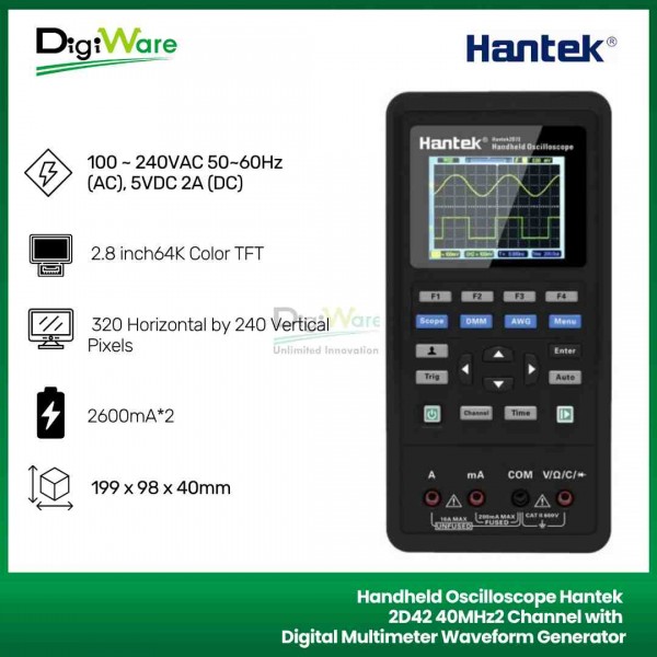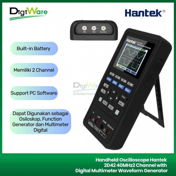Handheld Osciloscope Hantek 2D42 merupakan handheld osiloskop yang dibuat untuk kebutuhan mobilitas yang tinggi. Osiloskop ini memiliki ukuran yang kurang lebih sama seperti smartphone jadi mudah dibawa kemana-mana baik untuk keperluan indoor maupun outdoor.