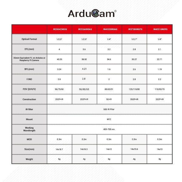 Arducam Low Distortion M12 Mount Camera Lens Kit for Arduino and Raspberry Pi Camera