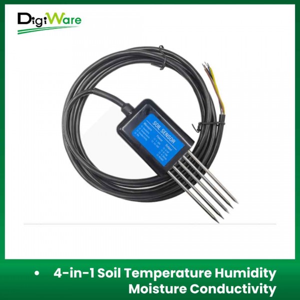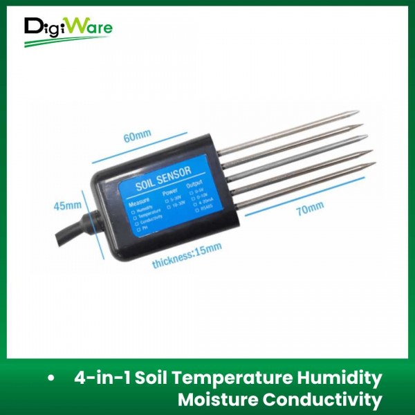 Soil Temperature Humidity Moisture Conductivity PH Sensor merupakan sensor all-in one yang dapat mensensing suhu, kelembapan, konduktivitas, dan PH pada tanah. Sensor ini memiliki output data RS485 yang dapat mengirimkan data dengan jarak yang cukup jauh sehingga sangat cocok digunakan pada lahan pertanian atau perkebunan yang jauh dari data center/pusat kontrol.