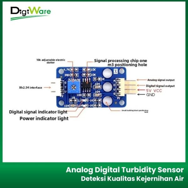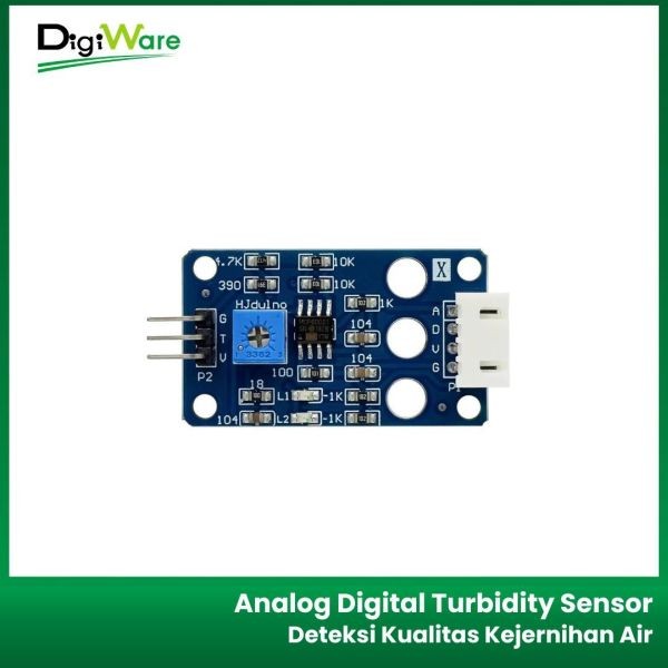 Merupakan sensor optik untuk mengukur tingkat kekeruhan air. Modul ini mampu mendeteksi tingkat kejernihan partikel dalam air. Sensor ini dapat digunakan untuk aplikasi industri ringan seperti pengukuran air limbah, sistem monitoring dll. Modul ini menyediakan output analog dan output digital.