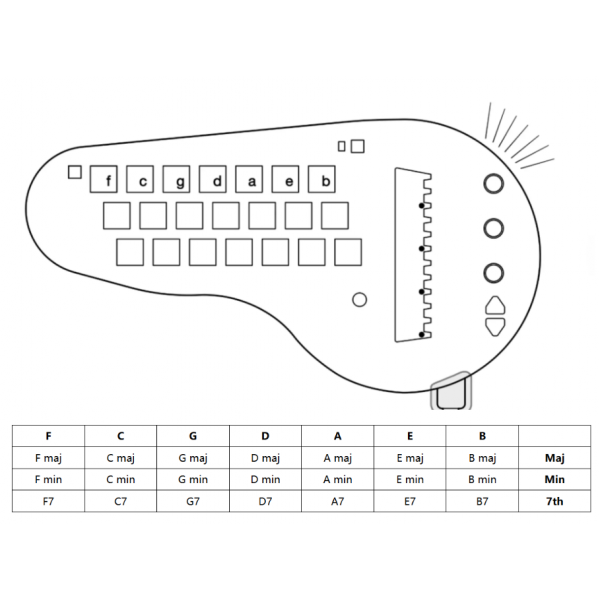 Instrumen ini dilengkapi dengan 21 tombol selector untuk memilih chord dan mendukung preset khusus untuk membuat kreasi musik tanpa batas. Selain itu, instrumen ini dapat digunakan sebagai MIDI melalui koneksi USB.