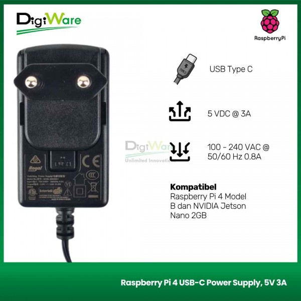 Adaptor untuk Raspberry Pi 4 dan NVIDIA Jetson Nano 2GB dengan output 5V 3A dengan konektor bertipe USB type C.