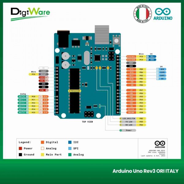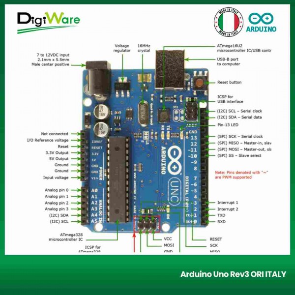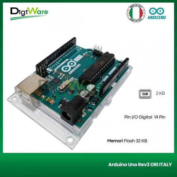 Arduino Uno Rev3 ORI Italy merupakan development board Arduino yang menggunakan mikrokontroler ATmega328. Arduino Uno merupakan board mikrokontroler terpopuler yang pernah dibuat oleh official Arduino.