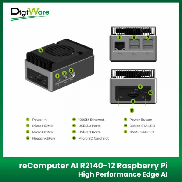 reComputer AI R2140-12 merupakan mini komputer AI berbasis Raspberry Pi 5 yang sudah menggunakan prosesor ARM Cortex-A76 Quad-core 64-bit dengan RAM sebesar 16GB. Selain itu, komputer ini sudah dilengkapi dengan hardware AI akselerator Hailo-8 yang mampu memberikan performa hingga 26 TOPS yang memungkinkan pengguna menjalankan aplikasi AI secara real-time, latensi rendah, dan efisiensi tinggi.