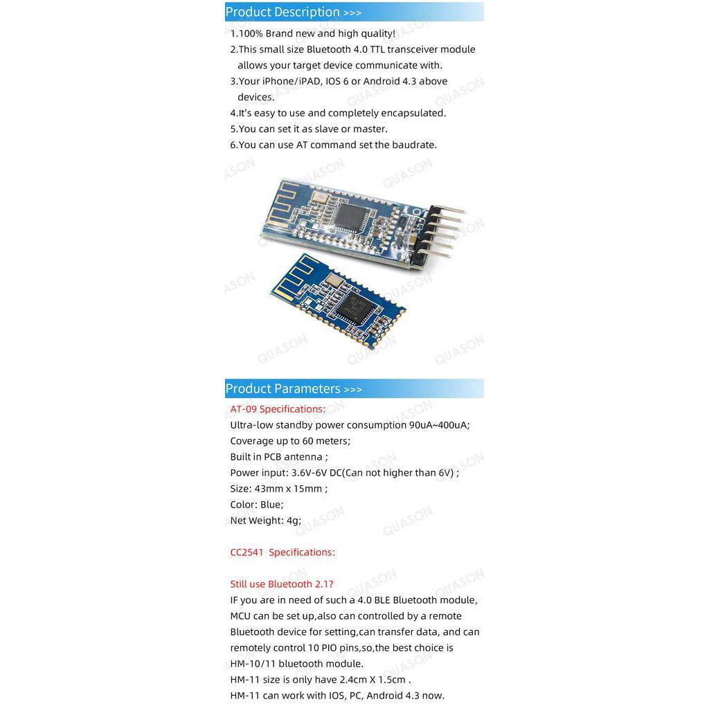 Bluetooth CC2541 BLE 4.0 merupakan modul bluetooth yang kompatibel dengan board Arduino. Dengan modul ini kita dapat menghubungkan board Arduino Uno dengan smartphone yang kita miliki. Bluetooth ini dapat terhubung dengan sistem operasi Android dan iOS.