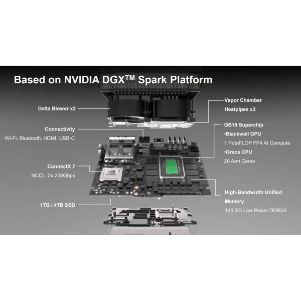 • GB10 Grace Blackwell Superchip (Performa AI 1petaFLOP Blackwell, 20-core Arm CPU)