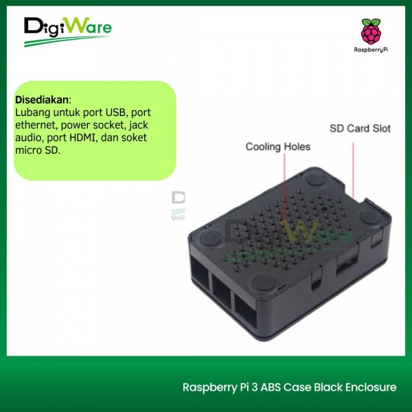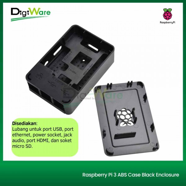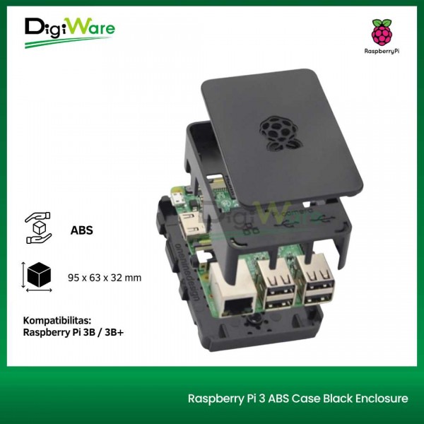 Case untuk Raspberry Pi 3B maupun Raspberry Pi 3 B+ yang terbuat dari bahan ABS hitam dengan dimensi 95 x 63 x 32 mm. Disediakan lubang untuk port USB, port ethernet, power socket, jack audio, port HDMI, dan soket micro SD.
