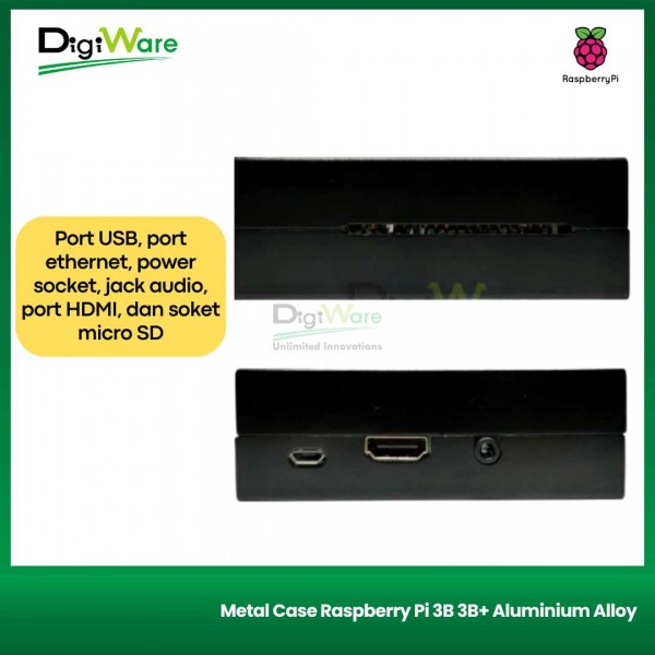 Case untuk Raspberry Pi 3B / 3B+ / 2B yang terbuat dari bahan aluminum warna hitam dengan dimensi 95 x 67 x 32 mm. Disediakan lubang untuk port USB, port ethernet, power socket, jack audio, port HDMI, dan soket micro SD. Serta disediakan lubang ventilasi udara yang cukup untuk meminimalisir overheat pada Raspberry Pi.