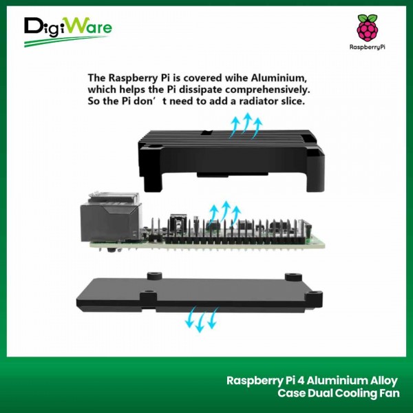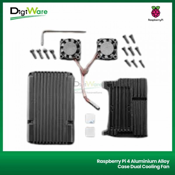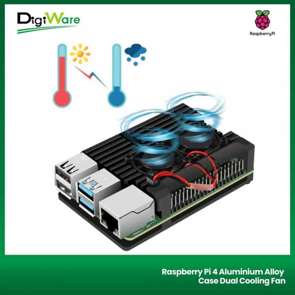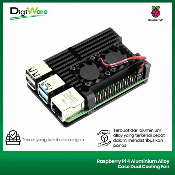Merupakan case aluminium (black) untuk Raspberry Pi 4 yang hadir dengan 2 buah fan untuk memberikan pendinginan maksimal terhadap Raspberry Pi 4.