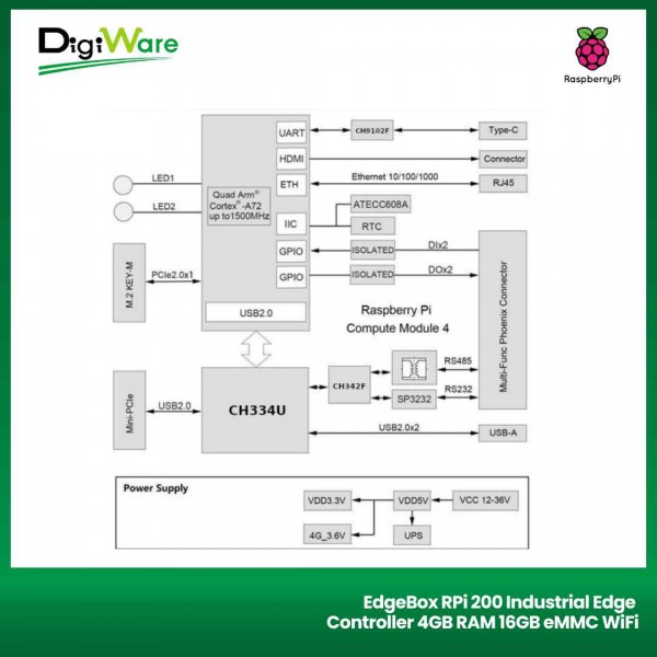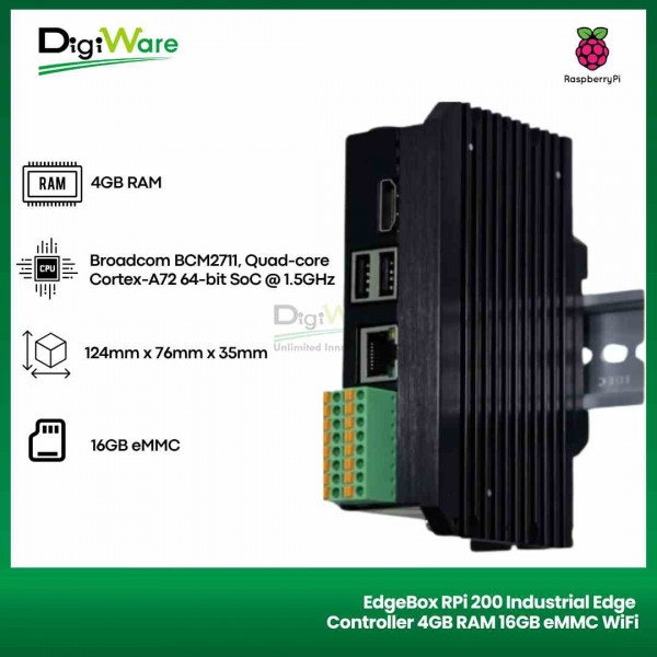 EdgeBox-RPi-200 merupakan all in one industrial edge controller berbasis Raspberry Pi Compute Module 4 (CM4). Produk ini di desain yang sangat kokoh serta memiliki skalabilitas yang tinggi sebagai perangkat keras industri. EdgeBox-RPi-200 sudah mendukung ekosistem perangkat lunak Raspberry Pi industrial.