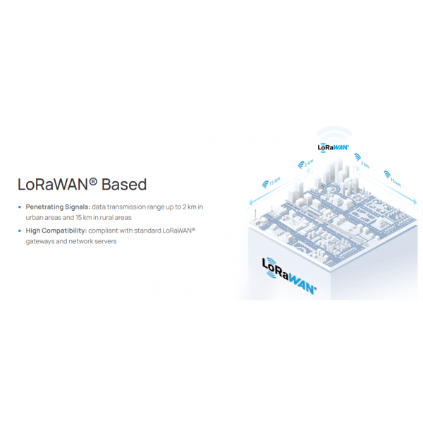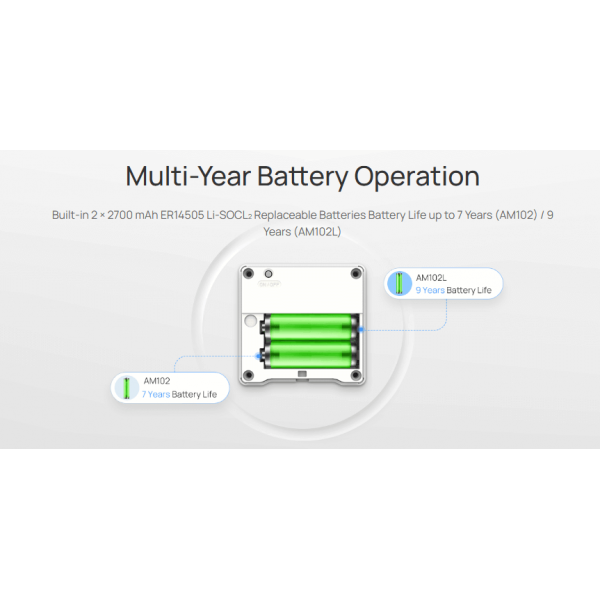 AM102 mendukung protokol LoRaWAN dimana data yang terukur dapat dikirimkan ke server melalui jaringan LoRaWAN yang dikenal sebagai protokol yang hemat daya. Perangkat ini dilengkapi 2 buah baterai yang dapat bertahan hingga sampai 7 tahun.