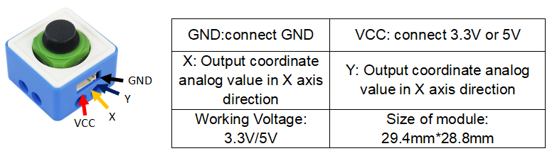 Modul rocker dapat dianggap sebagai potensio dengan dua saluran, yang dapat menghasilkan nilai analog sumbu X dan Y. Nilai awal sumbu X dan Y adalah 512. Karena perbedaan antara setiap modul rocker, nilai awal mungkin sedikit berbeda. Nilai modul rocker akan meningkat dari kiri ke kanan pada sumbu X, dan nilai modul rocker akan berkurang dari bawah ke atas pada sumbu Y. Rentang nilai analog keluaran sumbu X dan Y: 0 ~ 1023.