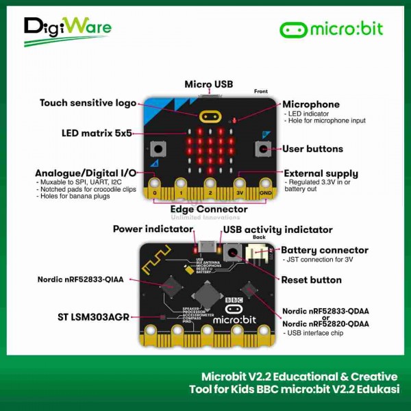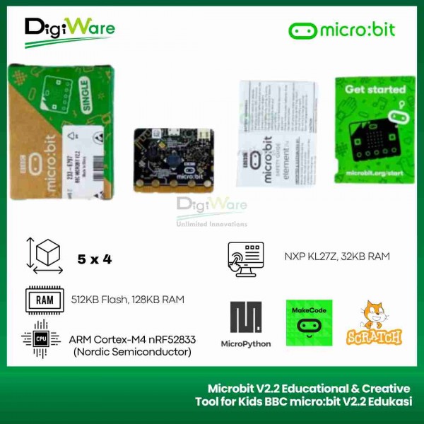 microbit V2.2 adalah komputer mini berukuran saku dengan ukuran 4 x 5cm yang di desain sebagai media bagi anak-anak untuk mempelajari pemograman. microbit ini dapat dapat mengajarkan anak-anak untuk membuat proyek-proyek interaktif seperti game, alat musik, robot, eksperimen ilmiah, wearable devices serta masih banyak lagi proyek-proyek menarik lainnya.