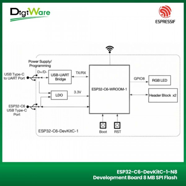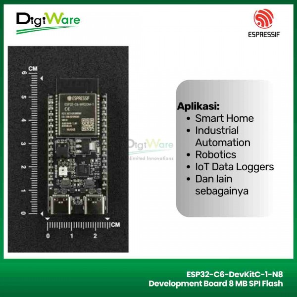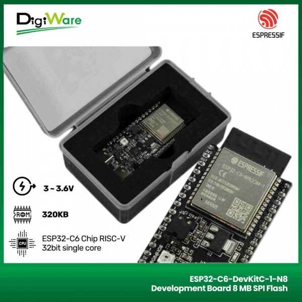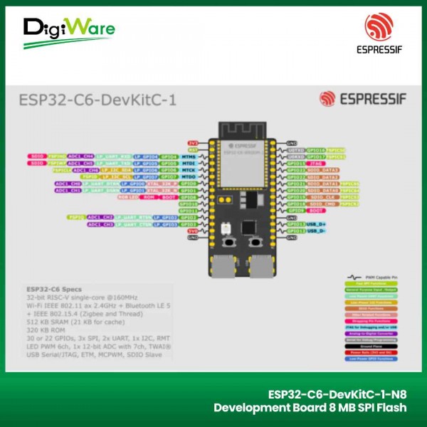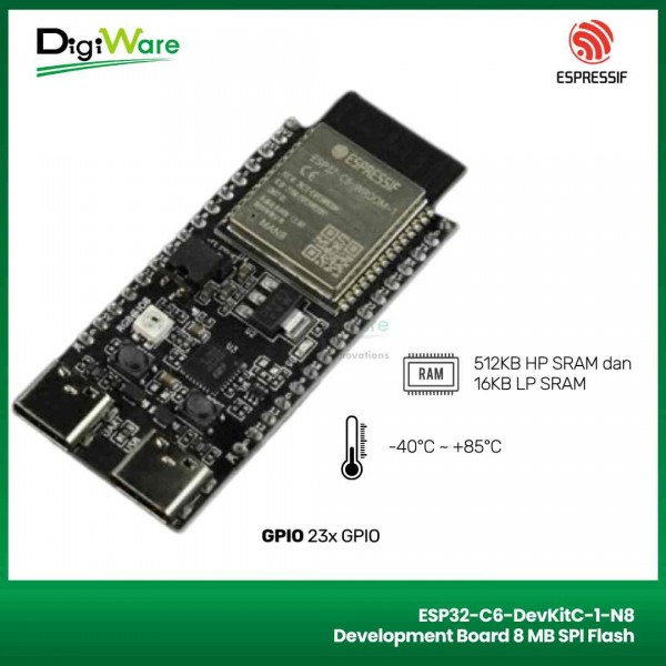ESP32-C6-DevKitC-1-N8 merupakan development board berbasis ESP32 C6 WROOM RISC-V 32bit single core dengan clock speed up to 160MHz. Board ini dilengkapi dengan Wi-Fi, Bluetooth Low Energy (BLE), Zigbee, dan Thread function.