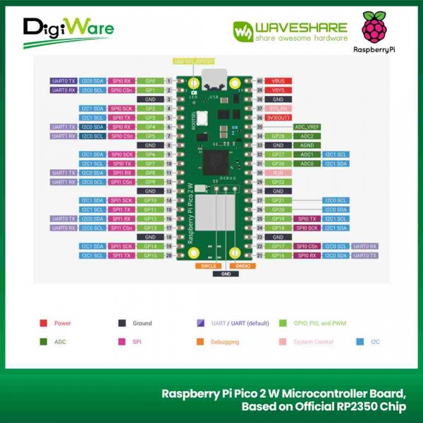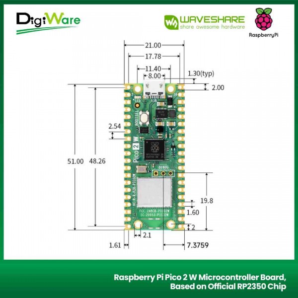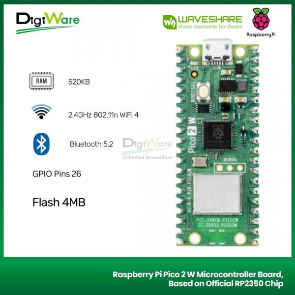 Raspberry Pi Pico 2W Microcontroller Board Based on RP2350 Chip merupakan development board berbasis mikrokontroler Raspberry Pi RP2350. RP2350 merupakan versi upgrade dari RP2040 yang sudah menggunakan prosesor ARM Cortex M0+ dan Hazard3 RISC-V (Dual-architecture) dengan kecepatan clock hingga 150MHz. Selain menggunakan dual-architecture, board ini juga sudah mendukung konektivitas wireless seperti: Bluetooth 5.2 dan WiFi 4.