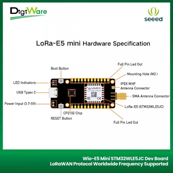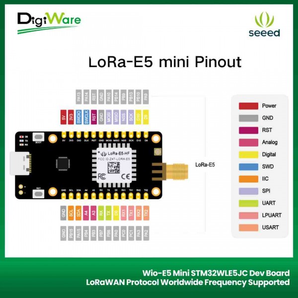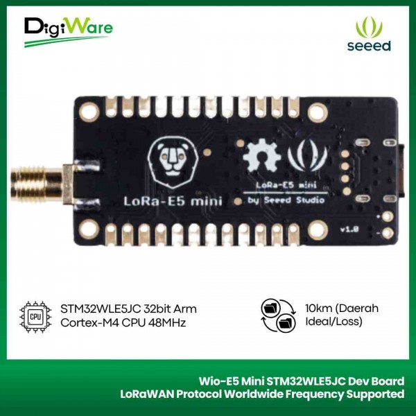 LoRa-E5 Mini STM32WLE5JC merupakan development board dari Seeedstudio yang sudah menggunakan mikrokontroler STM32WLE5JC dimana mikrokontroler ini didalamnya sudah terdapat MCU dan juga LoRa RF sehingga bisa digunakan untuk aplikasi LoRaWAN.