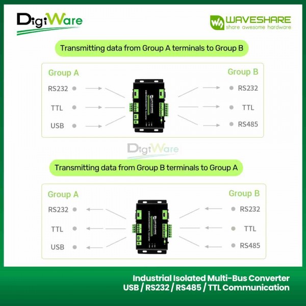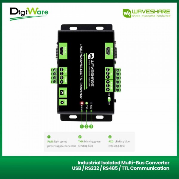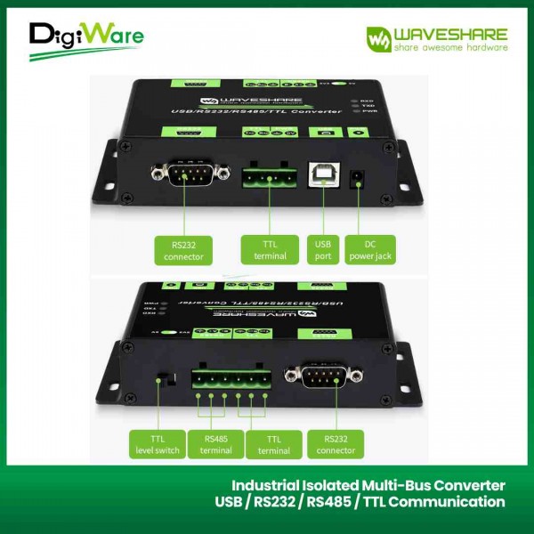 Industrial Isolated Multi-Bus Converter USB / RS232 / RS485 / TTL merupakan perangkat konverter multibus yang memiliki 4 antarmuka: USB, RS232, RS485, dan TTL. Sehingga alat ini cukup fleksibel untuk keperluan beragam komunikasi data. Selain itu, konverter ini juga dilengkapi rangkaian proteksi sehingga sangat mendukung digunakan untuk lingkungan industri.