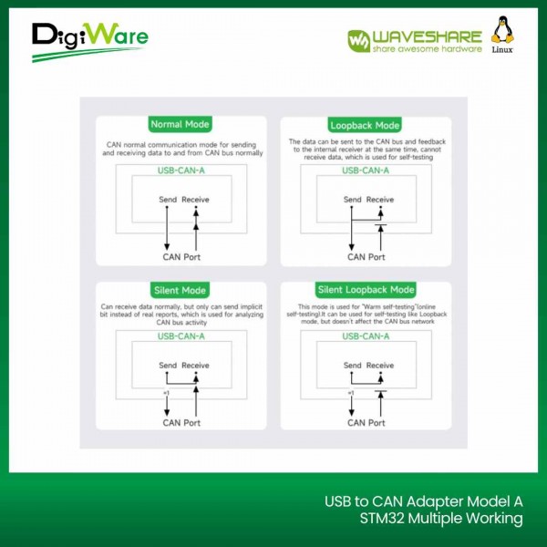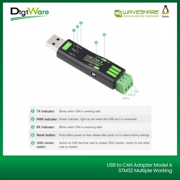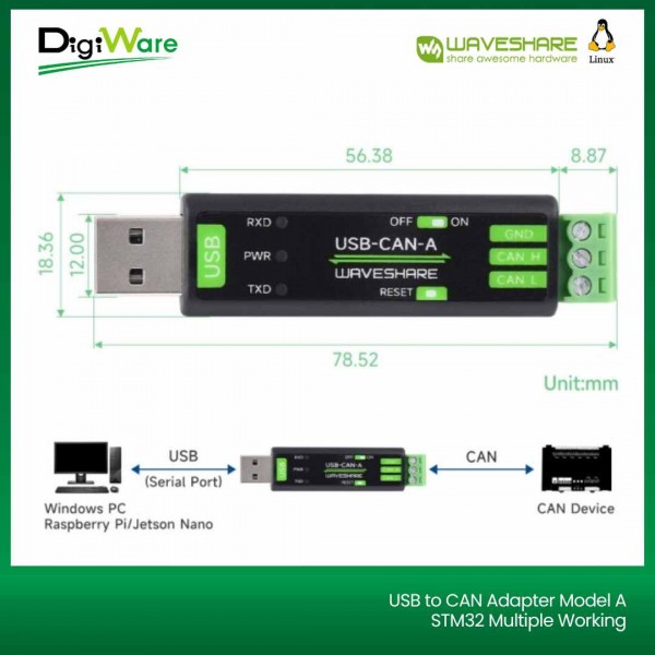 USB to CAN Adapter merupakan perangkat adapter dari USB bus ke CAN bus (USB to CAN Bus). Adapter ini support CAN 2.0A (standard frame) dan CAN 2.0B (extended frame) yang mendukung multiple working modes pada CAN Bus.
