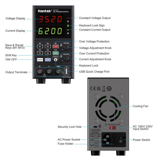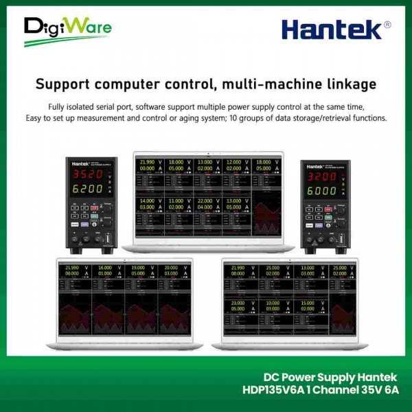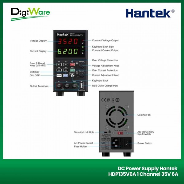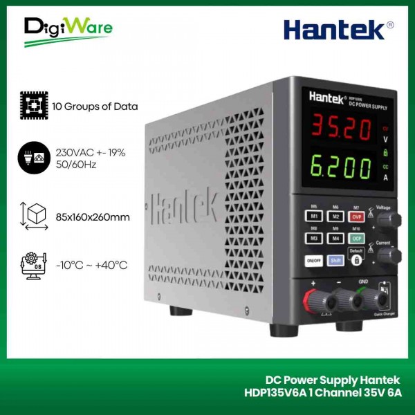 Hantek HDP135V6A merupakan DC power supply dari Hantek. Perangkat ini bisa mendrive beban hingga sampai 35V 6A (210W) yang dapat diatur output tegangannya. Perangkat ini juga dilengkapi dengan 4 digit display yang menampilkan parameter tegangan dan arus dengan resolusi sampai 10mV/1mA.