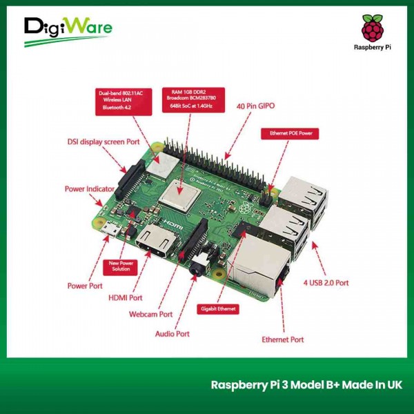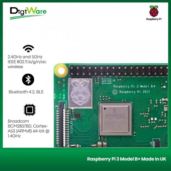 Raspberry Pi 3 Model B+ adalah versi terbaru dari seri Raspberry Pi 3, Pi 3B+ memiliki bentuk dan ukuran yang identik dengan Pi 3B, Namun apabila dibandingkan dengan Raspberry Pi 3 Model B, Pi 3B+ mengalami peningkatan di beberapa bagian hardware, mulai dari prosesor 64-bit yang kini memiliki clockspeed maksimum 1.4 GHz (sebelumnya 1.2 GHz pada Pi 3B), memiliki Gigabit Ethernet (support PoE) yang tentu jauh lebih kencang dari versi sebelumnya, memiliki heatsink pada prosesor untuk distribusi panas yang lebih baik, serta mendukung dual band WLAN 5 GHz dan 2.4 GHz.