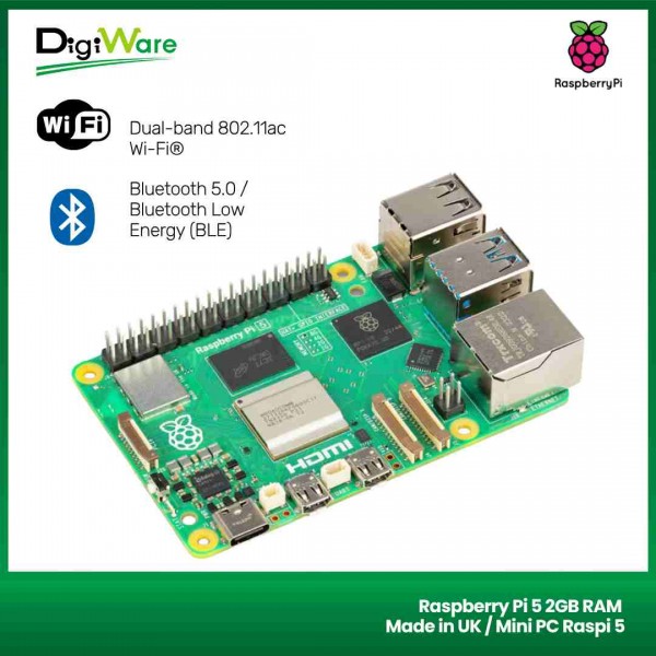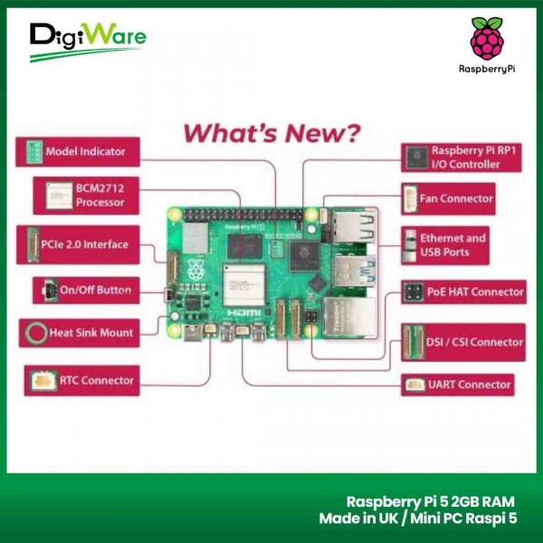 Raspberry Pi 5 dilengkapi dengan CPU ARM Cortex-A76 2.4GHz (16nm SoC) serta GPU VideoCore VII 800MHz, Raspberry Pi 5 bisa menjadi pilihan yang lebih baik untuk proyek yang membutuhkan pemosesan berkecepatan tinggi seperti program AI (Artificial Intelligence) maupun rendering grafis. Raspberry Pi 5 ini mangakomodasi RAM LPDDR4X-4267 2GB, bahkan sudah terdapat indikator kapasitas RAM pada board.