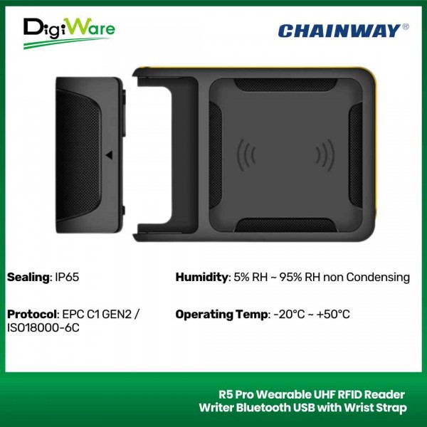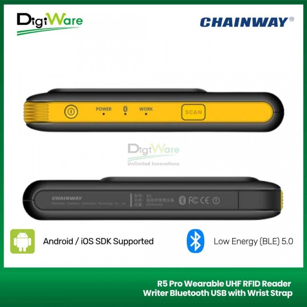 R5 Pro Wearable UHF RFID merupakan device RFID yang dapat langsung dipakai pada tubuh manusia (tangan). Perangkat ini menggunakan chip Impinj E710 yang dapat membaca tag dengan jarak read lebih dari 14m.