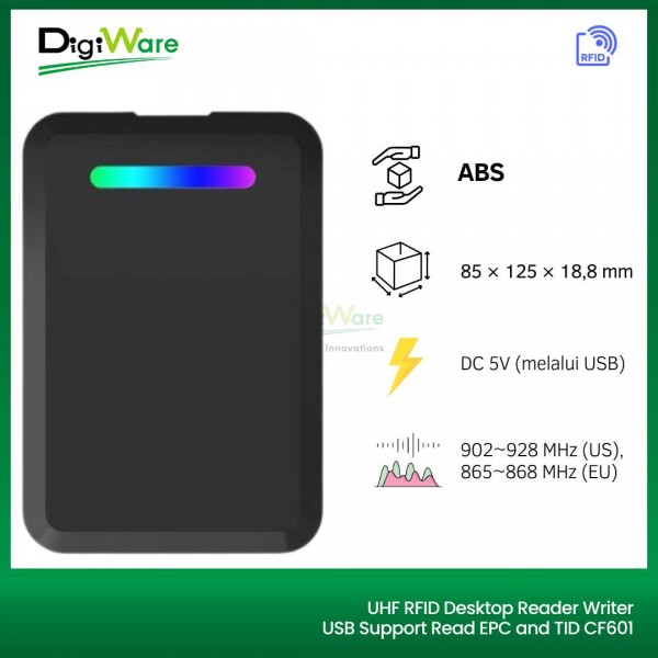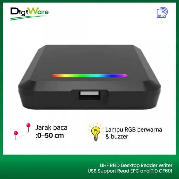 CF601 UHF RFID Desktop Reader Writer adalah perangkat pembaca/penulis kartu UHF berbentuk desktop yang mendukung koneksi USB dengan berbagai mode output, termasuk serial virtual dan emulasi keyboard. Dilengkapi dengan dukungan Wiegand 26/34, perangkat ini ideal digunakan untuk aplikasi kasir, manajemen keanggotaan, absensi, hingga penerbitan kartu otorisasi dengan kinerja yang cepat dan praktis.