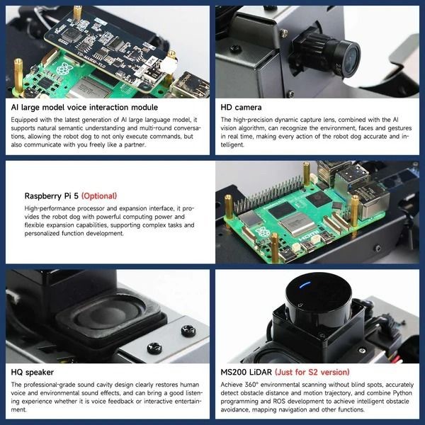 DOF Robot Dog DOGZILLA S2 merupakan robot pintar berbentuk hewan anjing bionik berbasis AI. Robot ini menggunakan board Raspberry Pi 5 yang memiliki proses komputasi dua kali lipat lebih baik dibandingkan dengan Raspberry Pi 4B.