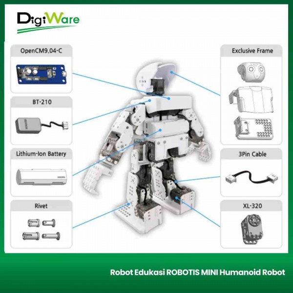 Kit robot humanoid dengan 16 buah derajat kebebasan. Kit robot ini cocok digunakan untuk keperluan pembelajaran maupun lomba robotika. DARWIN-MINI telah dilengkapi dengan kontroler dan servo cerdas yang dapat diprogram menggunakan bahasa C sederhana.