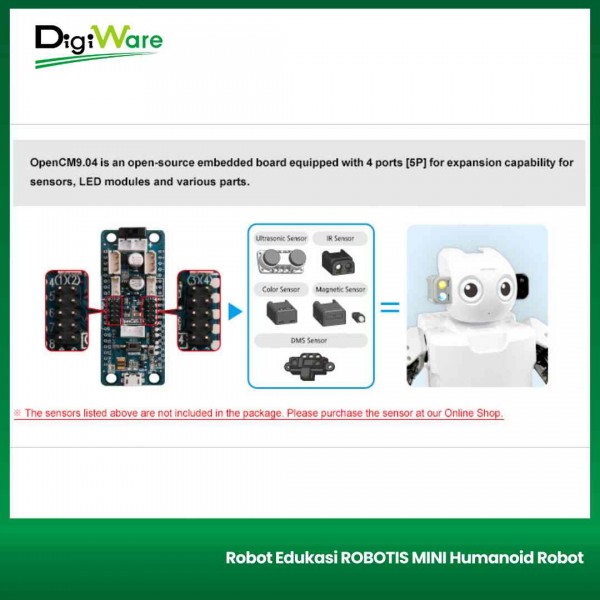 - Kompatibel dengan berbagai macam modul sensor / aktuator 5-pin dari Robotis (IR Sensor, Touch Sensor, Color Sensor, Temperature Sensor, Ultrasonic Sensor, dll.).