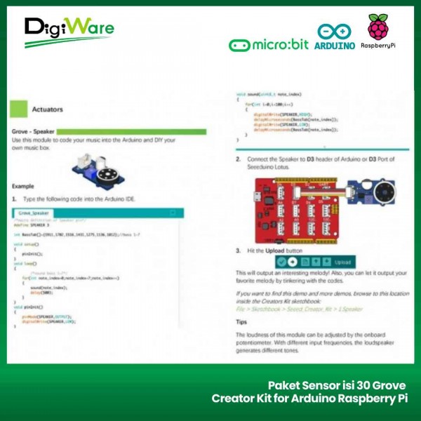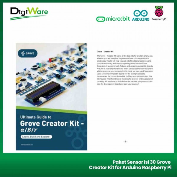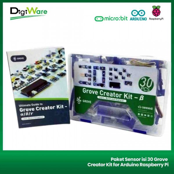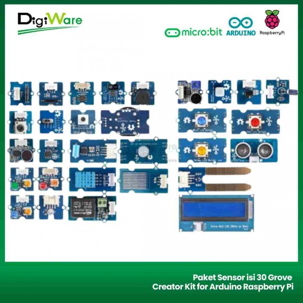 Grove Creator Kit merupakan sekumpulan modul grove yang terdiri dari 30 buah komponen I/O seperti LED, buzzzer, relay, dsb. Modul pada kit ini dapat dengan mudah Anda hubungkan ke Arduino, Raspberry Pi, micro:bit dan mikrokontroller lain untuk membuat berbagai project menarik. Pada kit ini juga disediakan guide book yang dapat Anda gunakan untuk belajar membuat project dengan modul-modul grove yang ada pada kit ini.