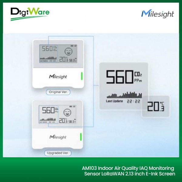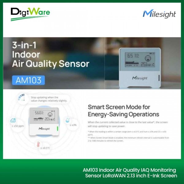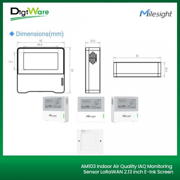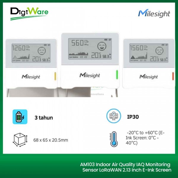 AM103 adalah sensor pemantau kondisi lingkungan dalam ruangan yang ringkas, dirancang untuk mengukur suhu, kelembaban, dan kadar CO2. Data hasil pengukuran ini akan ditampilkan secara real-time pada layar E-ink 2.13 inch, sehingga memudahkan pengguna untuk menilai kualitas dan kenyamanan lingkungan didalam ruangan. AM103 banyak digunakan di berbagai tempat seperti kantor, toko, ruang kelas, rumah sakit, dsb.