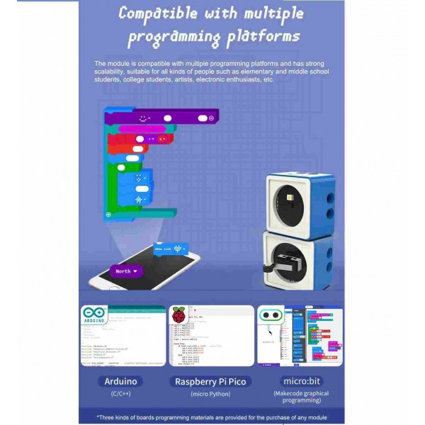 Dengan memiliki papan ekspansi yang tepat, modul ini bisa diprogram menggunakan MakeCode (Microbit), Arduino IDE (Arduino UNO), atau python (Raspberry Pi Pico) membuatnya cocok untuk kelas, pembelajaran mandiri maupun proyek kreatif.